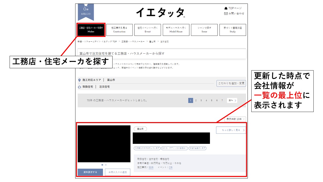 ブログを更新することで、「工務店・住宅メーカーを探す」の欄で自社情報が最上位に表示されます。