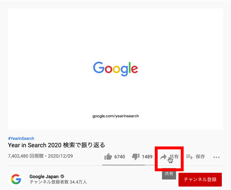 2.埋め込みたい動画の再生画面を開き、「共有」をクリックします