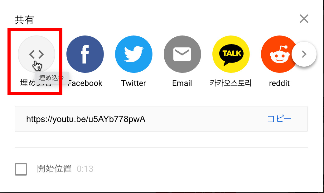 3.共有画面が表示されますので、「埋め込む」をクリックします