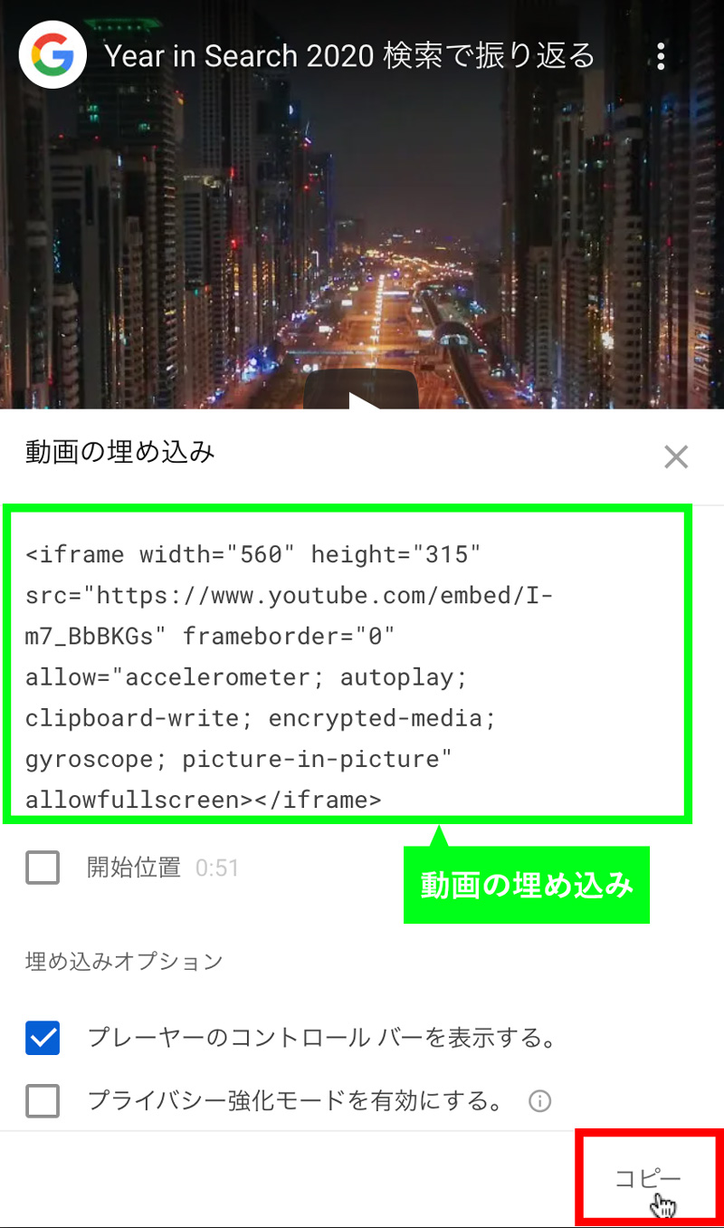 4.画像の緑枠内の動画の埋め込みタグをコピーしてWEBサイトに埋め込むことで動画が表示されます。
